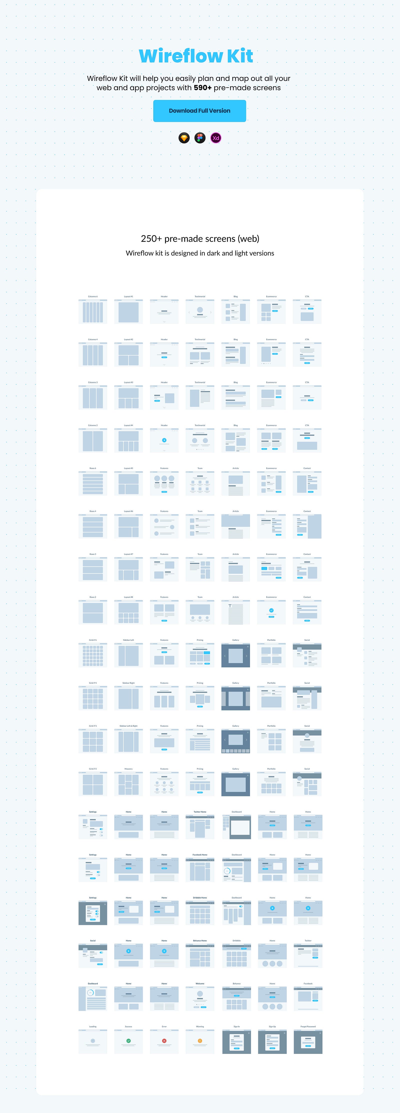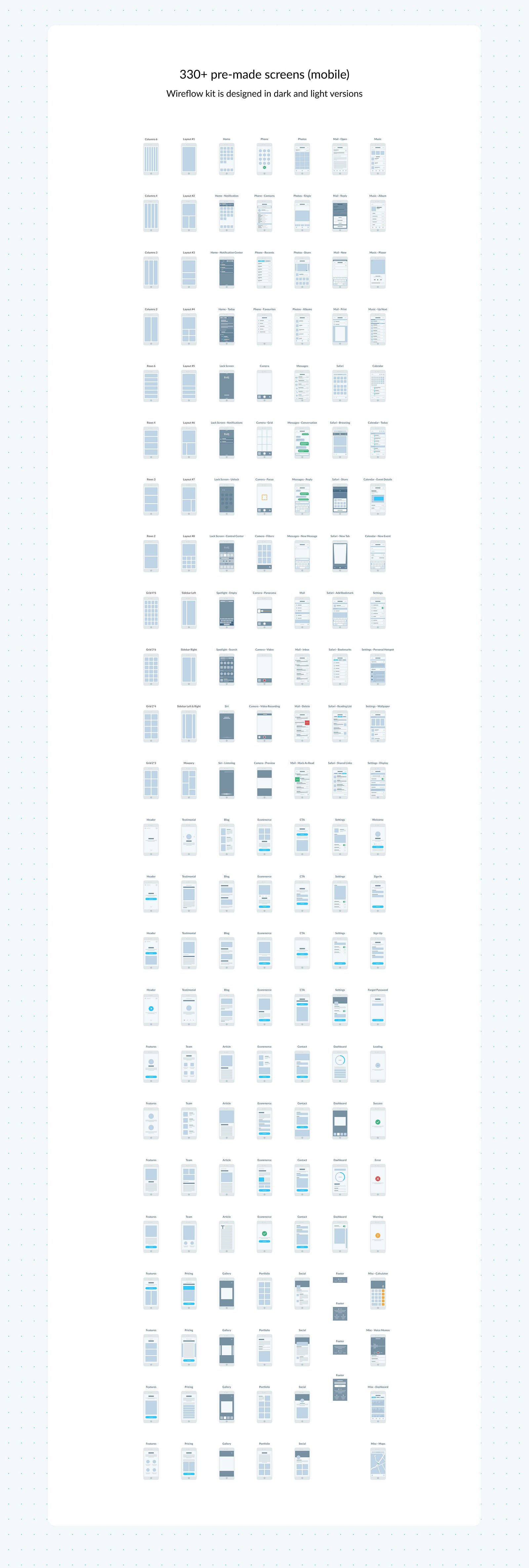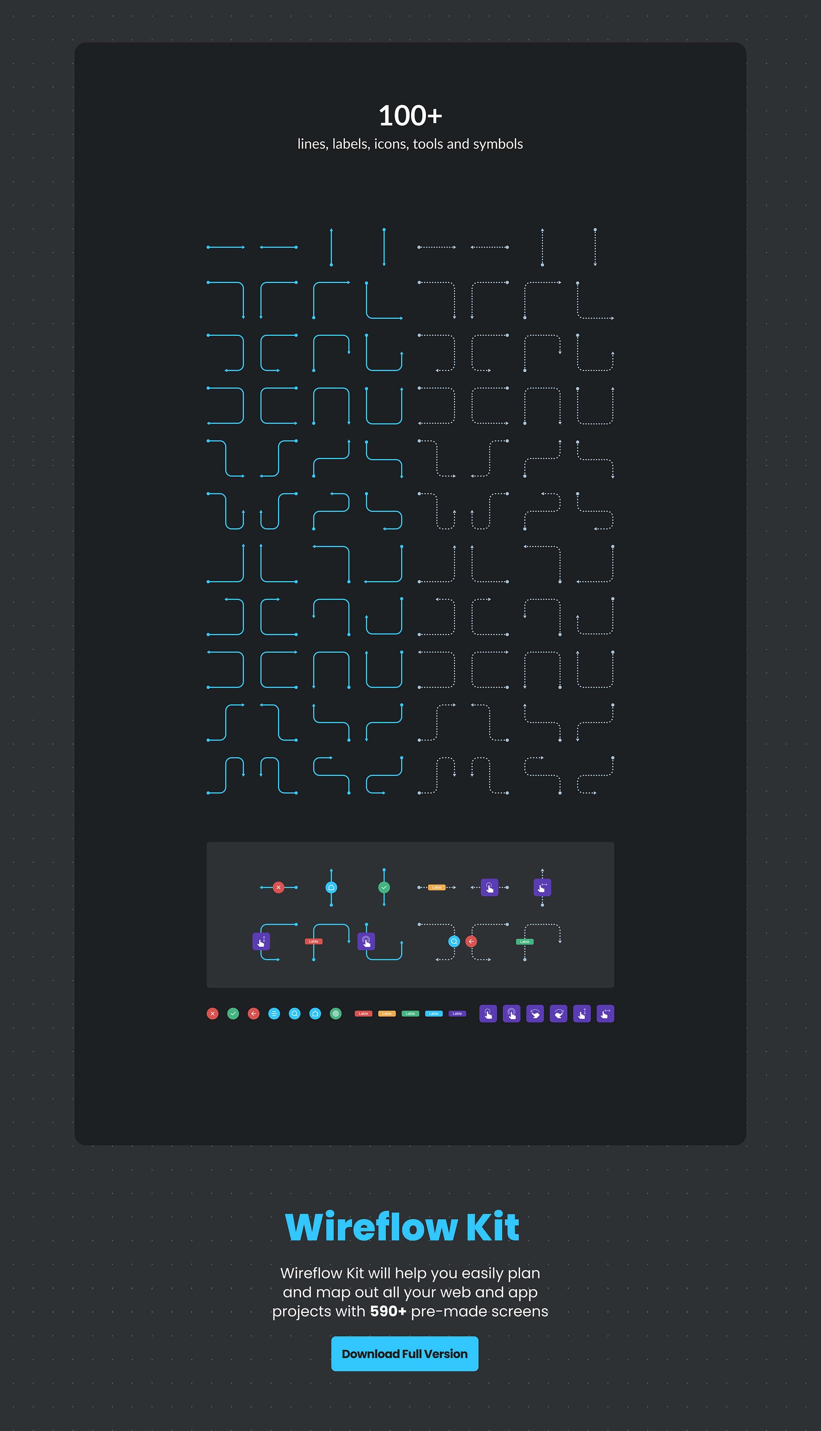 Wireflow kit is designed in dark and light versions, composed of 590+ pre-made templates for desktop and mobile.